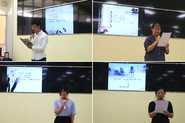 经过初步筛选,共有六位来自全校的参赛选手进行了现场朗读。其中,来自丝路商学院工管国产1601的马骅,深情朗读诗歌《爱》表达对男友的喜欢。心理1601的王艺莹朗读《荆棘鸟》的部分篇章,向大家分享了自己以前在困顿中挣扎,后来因为受荆棘鸟的影响而理清现实的过程。此外,来自法学1602的吕骆,他选用了《狼王梦》这本书的篇章,用狼族的骄傲和牺牲精神歌颂伟大的母爱。法学1604班的张婷朗读的是古典文学,她向我们展示了中华文化中的华丽瑰宝。来自心理1501班的王礼晗,朗读的是杨绛先生的《我们仨》,她向我们分享了她对书中这一份深刻的感情的感悟,对那些能够用“我们仨”来追忆的时光表示分外珍惜。还有一位选手她与前几位不同的是她是一位基督信徒,她就是来自社会1501班的叶朦朦,她向大家分享了关于信仰的理解。她认为,信仰就像一面旗帜,引领着他们的方向。