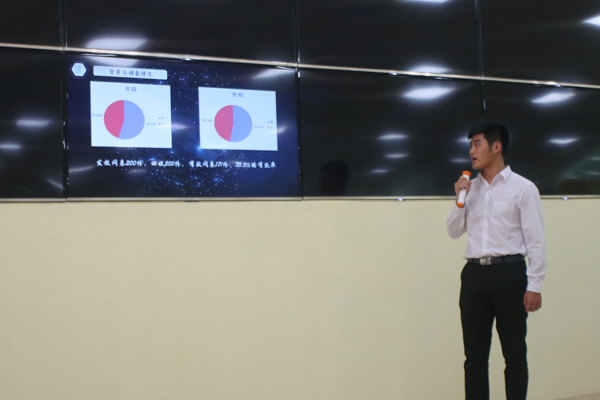 活动由一段关于读书的采访视频开场,视频里同学们就读书的习惯、数量和是否阅读纸质书等问题发表了自己的观点。视频播放结束之后,社会调查研究协会社长高萌通过一系列的数据图表,分析公司员工目前的读书现状,同时结合这些现状提出了几点建议,他希望我们多读书,尤其是多读纸质书;希望学校能够为员工构建一个借书与交流的平台,分享阅读心得。