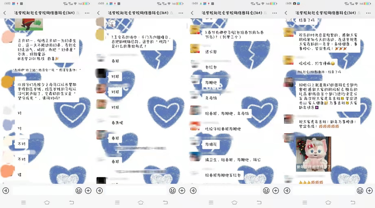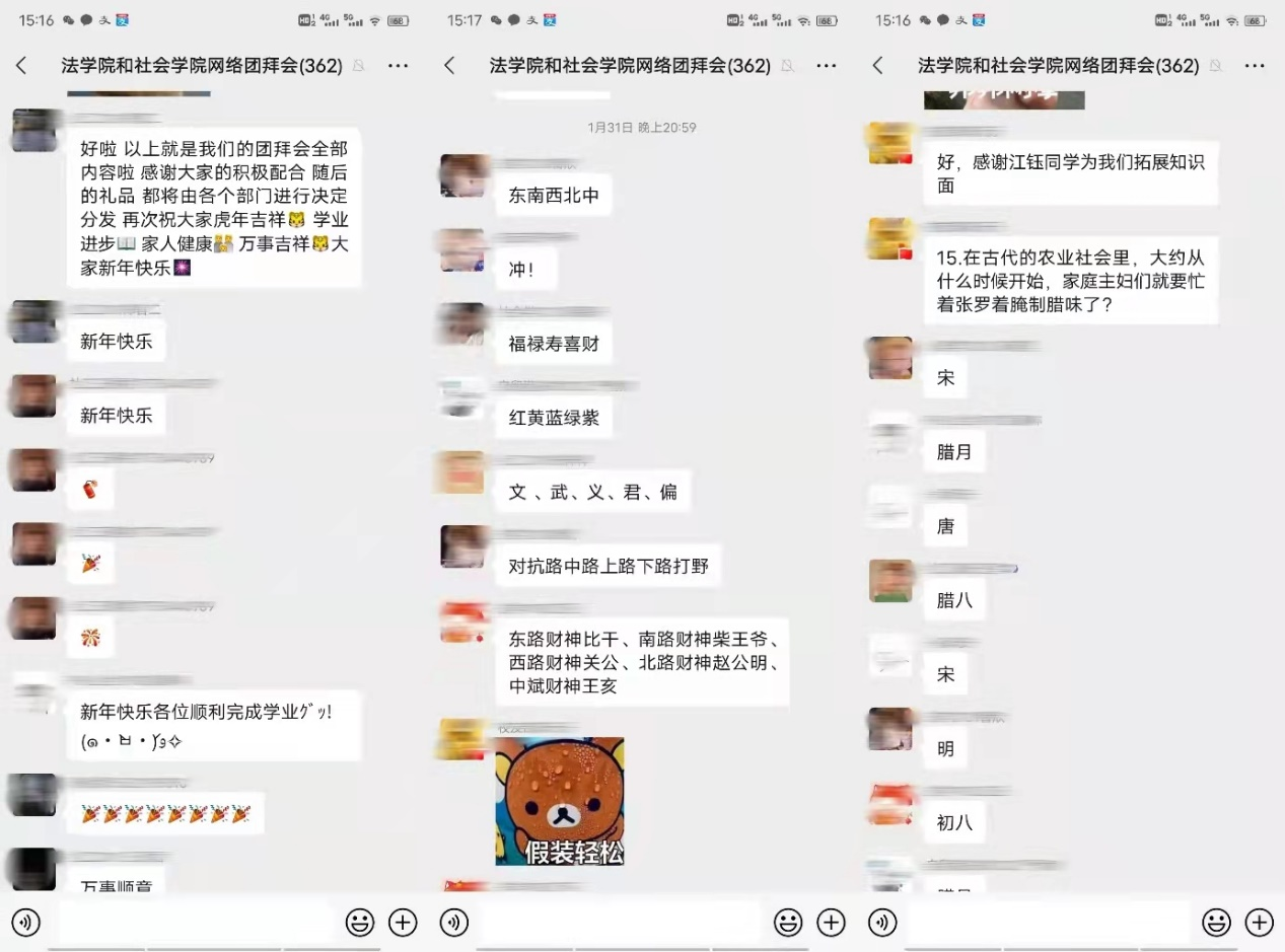 团拜活动是ylzzcom永利总站线路检测和社会学院一年一度的“家庭盛会”,借助组织同学们参与网络游戏的方式进行互动,共同庆祝新春佳节,互道暖心祝福,营造浓厚温馨的年味,自活动通知发布后活动群成员不断增加,获得了同学们喜爱。本次活动设计了中华小曲库、猜美食、年画找不同、虎视眈眈、飞花令、虎字成语接龙、方言猜猜猜、年味文化知识大挑战等八个游戏,同学们积极参与各个小游戏,并有序地按照游戏规则作答,学习与了解春节习俗以及传统诗词,并在虎字游戏接龙环节中上演“抢答”,活动群内同学们热情高涨,参与度较高,同学们在参与活动学习知识的同时也愉悦了心情,令线上过年“有滋有味”。